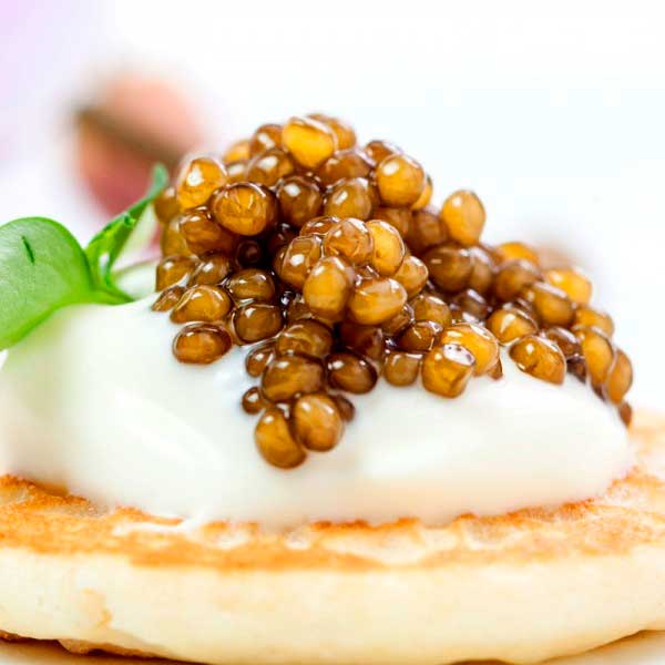 Perfecto acompañante del caviar para una velada única. Con un toque dulce, los blinis combinan a la perfección con cream agria o mantequilla con una cucharada de Caviar Sos.